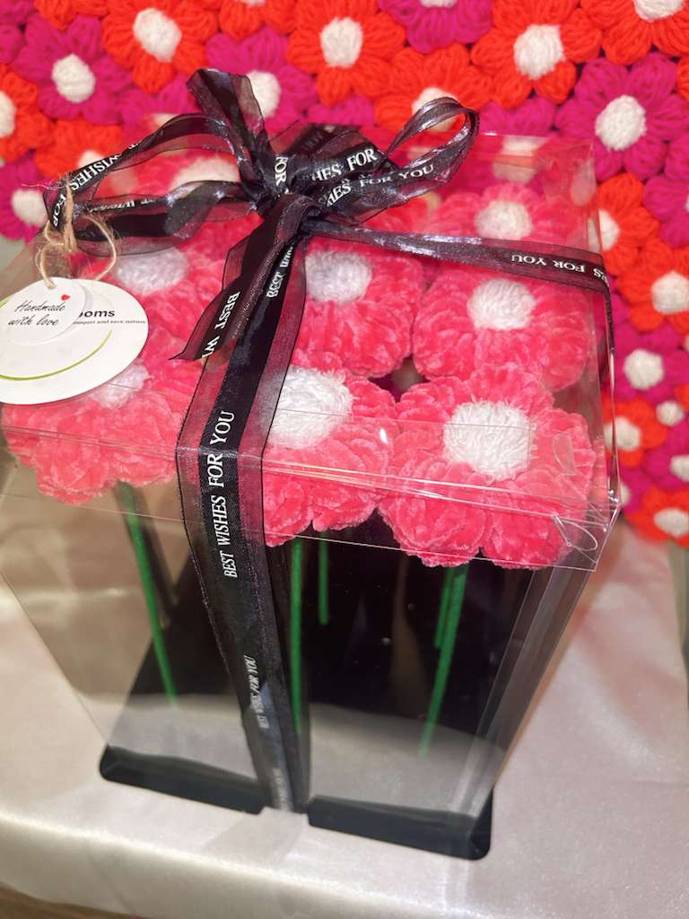 Add a touch of softness and charm to your gifting with this beautiful pink velvet daisy handicraft yarn flower bouquet. Expertly handcrafted using soft, velvet-textured yarn, each flower features a rich pink hue and a plush finish that feels luxurious and eye-catching. The bouquet includes 9 beautifully crafted pink daisy flowers, arranged on sturdy green stems and presented in a transparent premium gift box for a refined presentation.